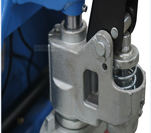 - Gạt ngược cần trên tay cầm lên để hạ kiện hàng xuống